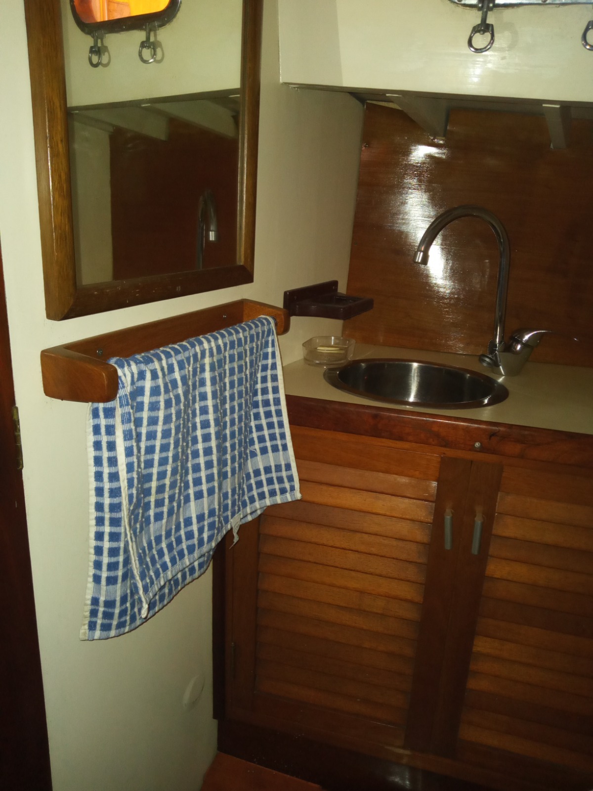 Mesada con bacha acero y grifería monocomando FV, con bajo mesada puertas tipo persiana de cedro, espejo, toallero y porta rollo de madera
