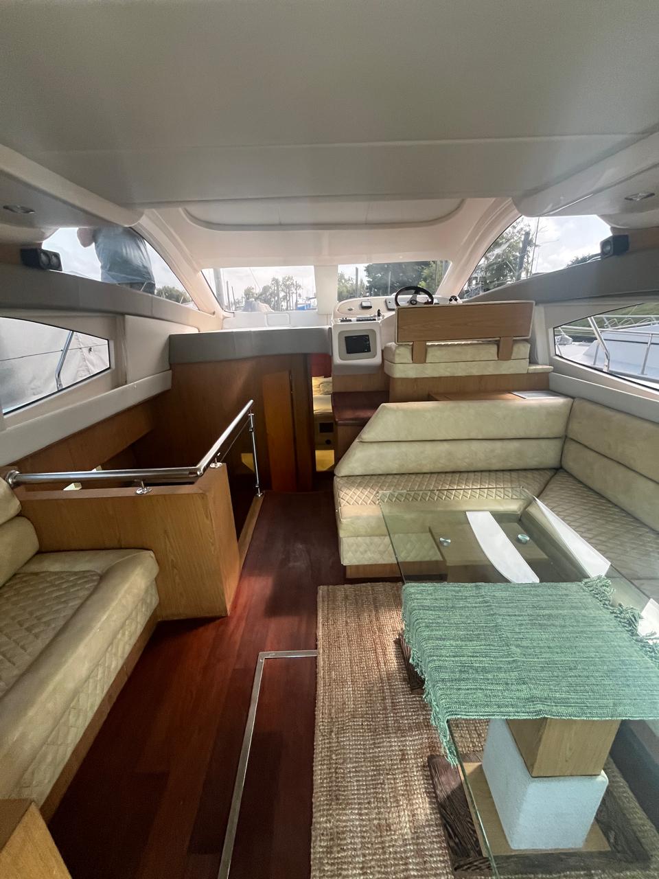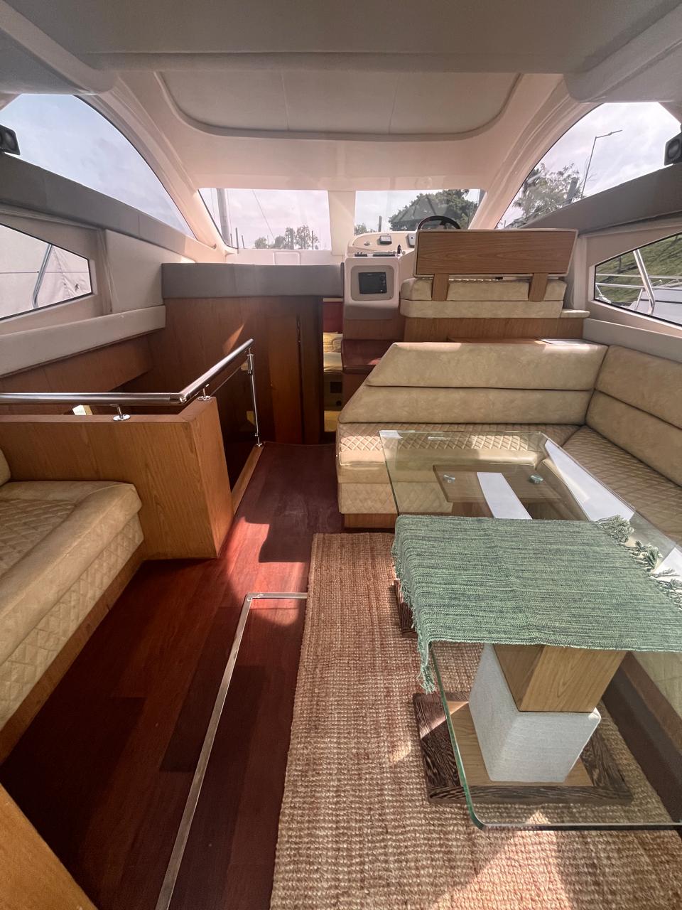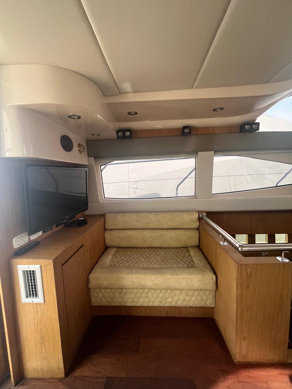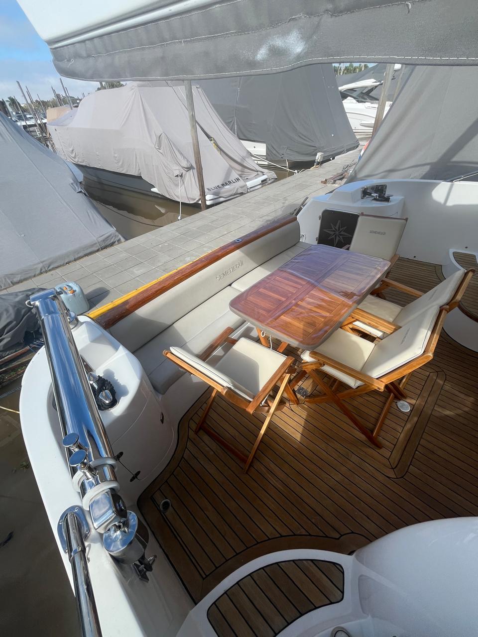 Salon con mesa y TV- mesa exterior de madera laqueada con 4 sillas- colchonetas de proa- bimini- carpa- duchador agua fría y caliente exterior en planchada de popa
