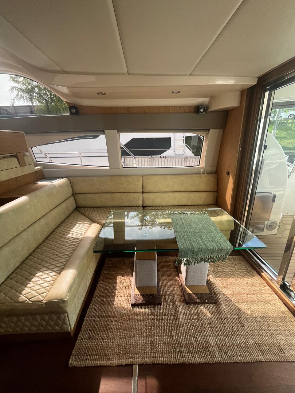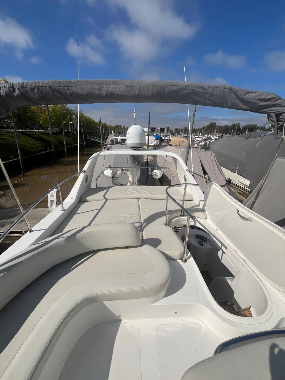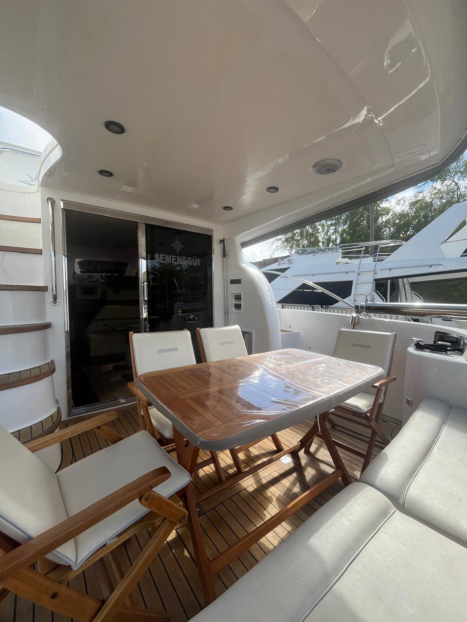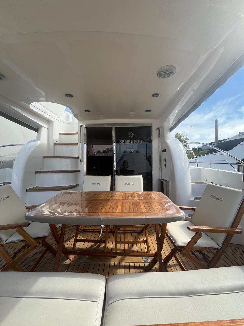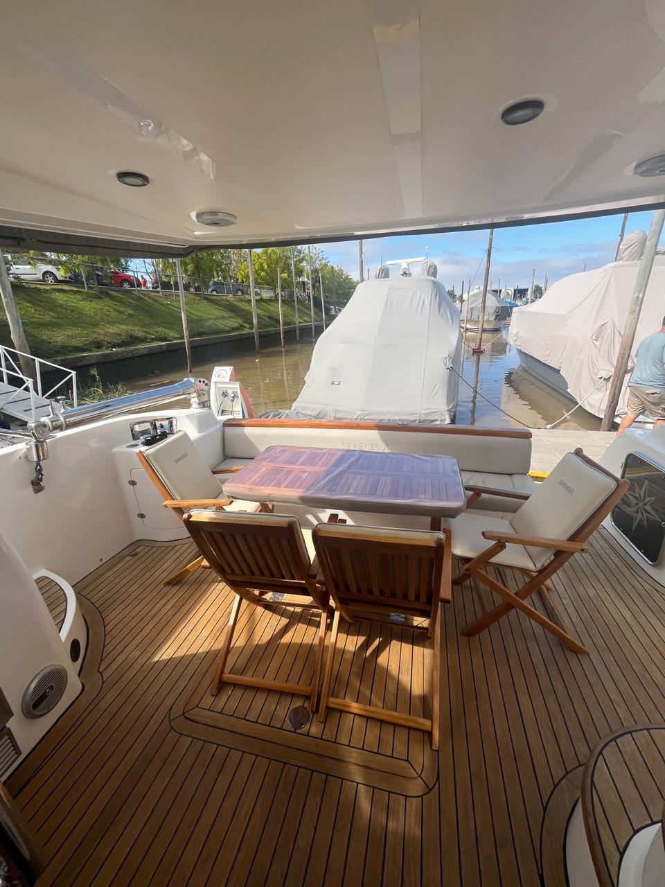 Salon con mesa y TV- mesa exterior de madera laqueada con 4 sillas- colchonetas de proa- bimini- carpa- duchador agua fría y caliente exterior en planchada de popa